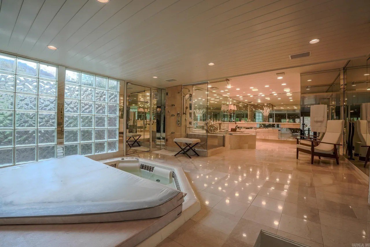 The primary suite boasts a spa-inspired bathroom with in-floor hot tub, sauna, and steam shower. (Realtor.com)