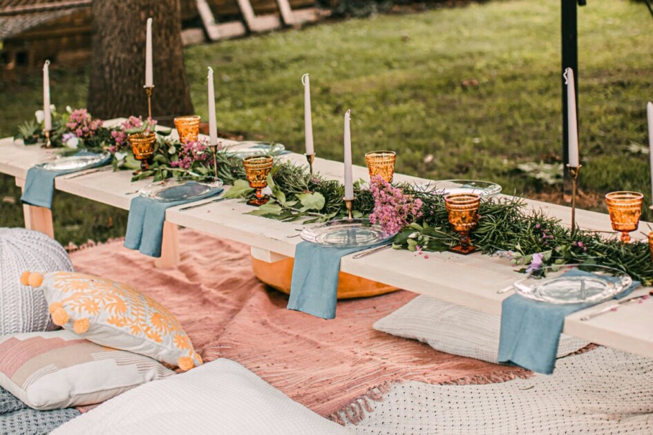 “Transform your backyard or living room into a dreamy picnic setup with layered rugs, floor cushions, and low tables,” suggests Alexandra Garnica, owner and lead planner of Desert Flower Events. At this elevated picnic, “serve seasonal small bites, chilled wine, and feature light floral arrangements for a relaxed and stylish gathering,” recommends Alexandra.