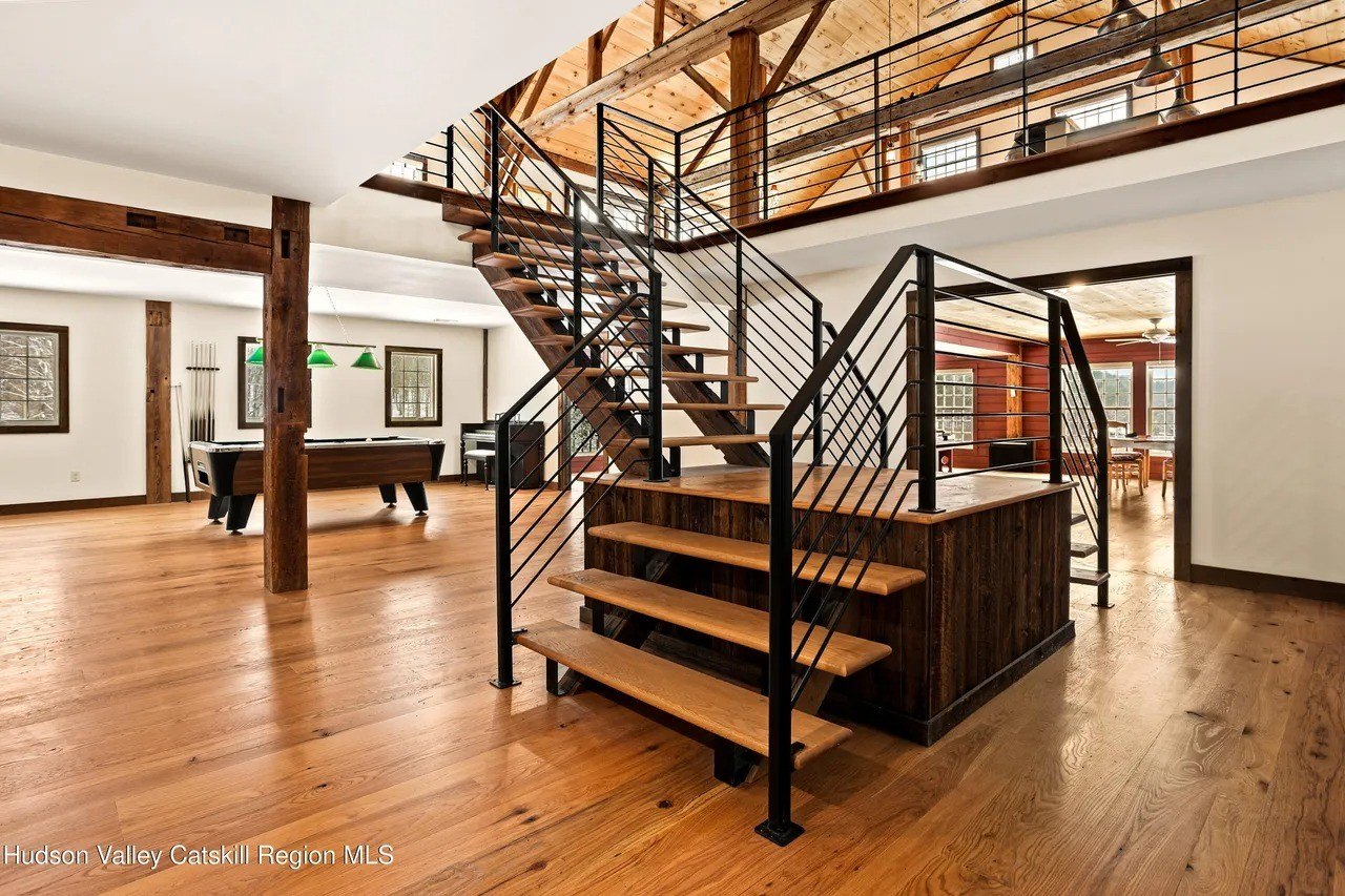 Found throughout the enormous barn conversion are vaulted wood ceilings, wide-plank floors, exposed beams, expansive windows, built-ins, a grand floating grand staircase, and an elevator for easy access.