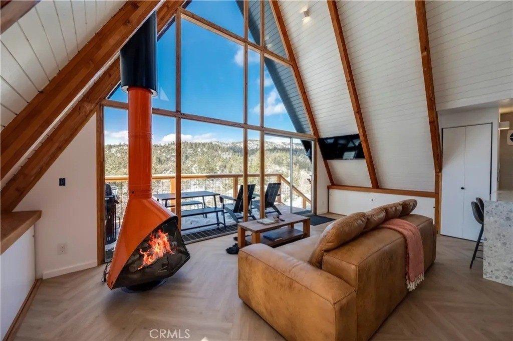 In 2022, the 720-square-foot structure was “brilliantly restored” to offer herringbone hardwood floors, a floating wood staircase, a midcentury Malm fireplace, and a 25-foot window to capture the breathtaking views. It is currently being used as an income-generating, short-term rental property.