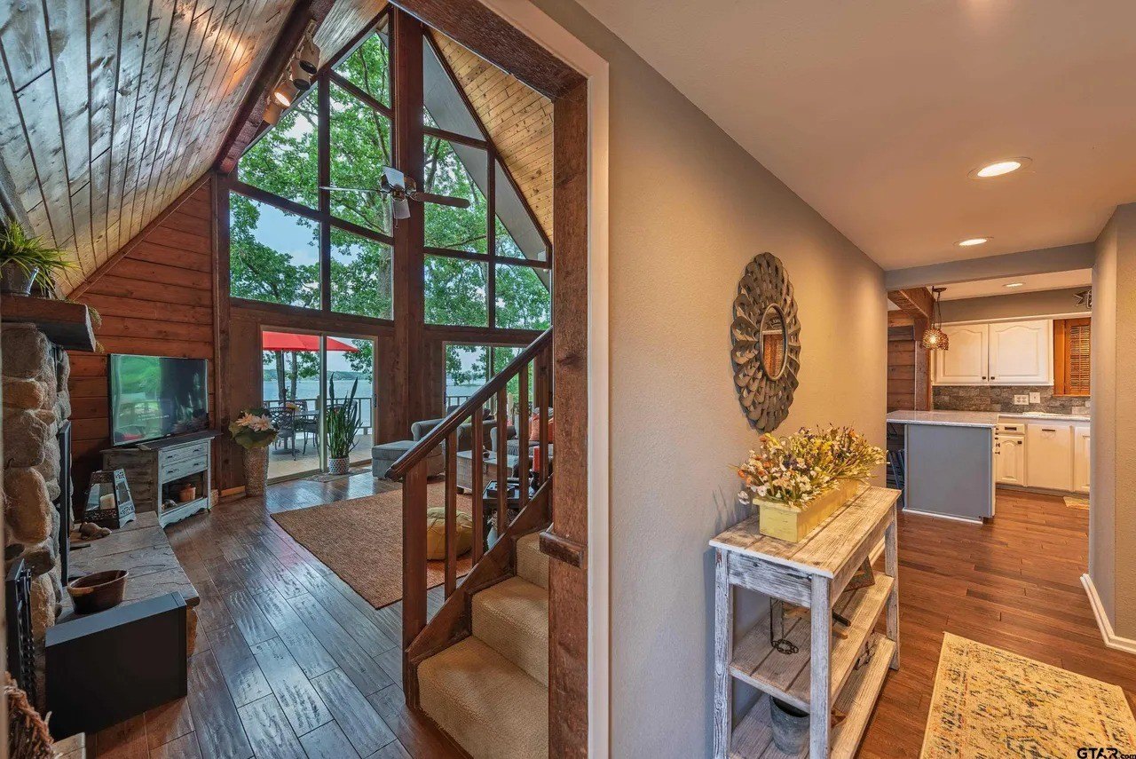 The waterfront property boasts a wall of windows that offer unobstructed views spanning “two miles of open water.” An open floor plan features a modern kitchen with quartz countertops, a great room with a wood-burning stone fireplace, and two updated bathrooms.