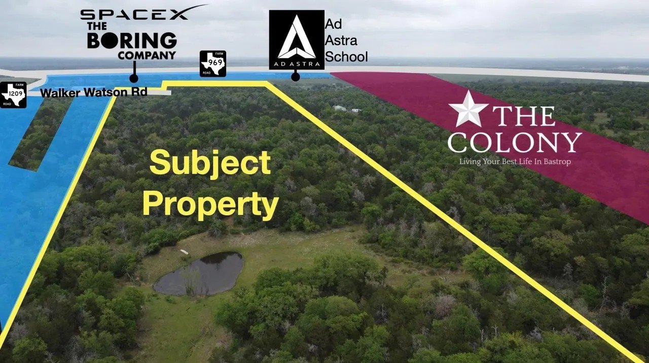A $12.4 million 146-acre parcel with no zoning restrictions on Walker-Watson Road, off of FM (Farm-to-Market Road) 1209, touts its proximity to Musk central.