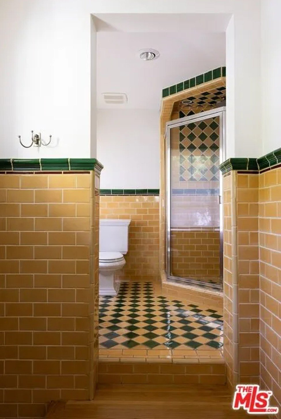 However, there are several pops of color throughout the abode, including a large pink couch in one of the living areas, as well as funky yellow-and-green tile in a bathroom.