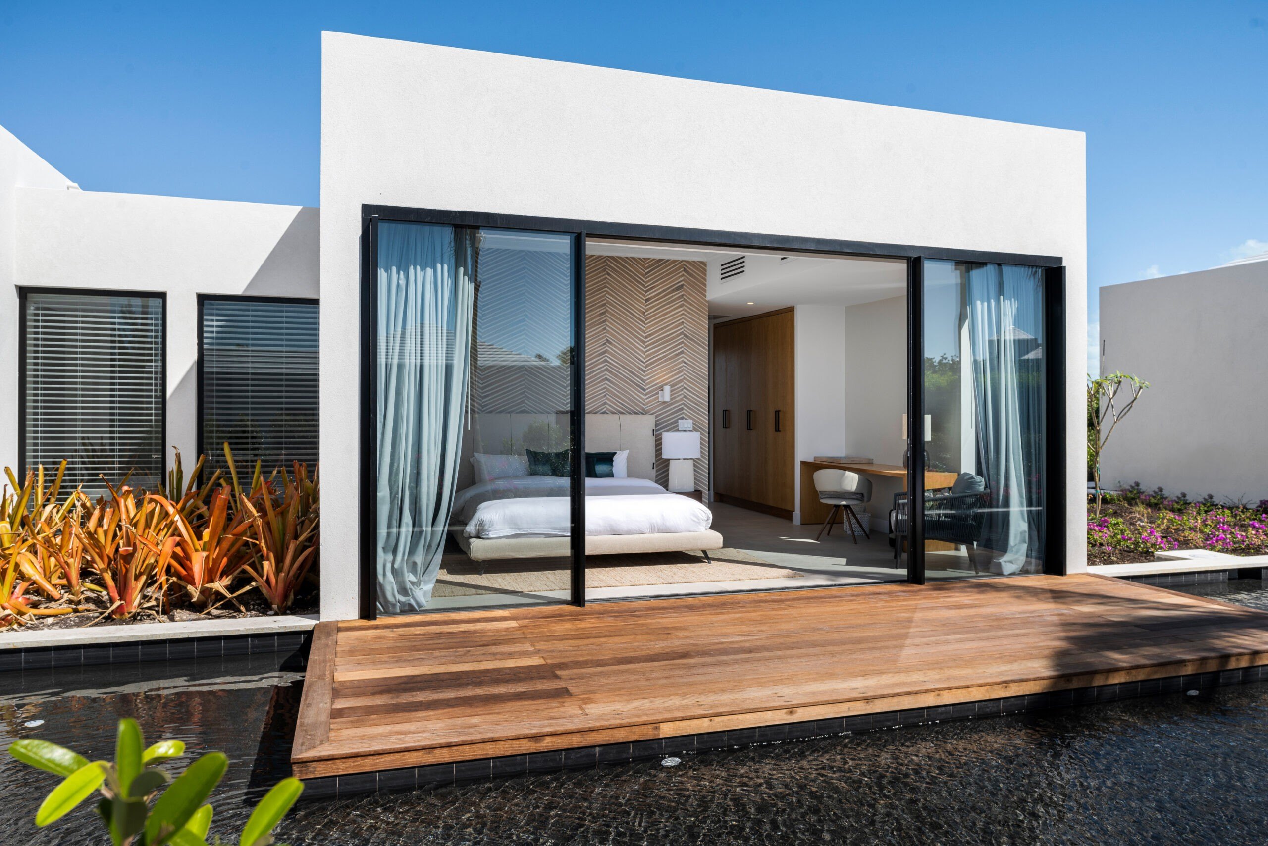 The bedrooms come complete with French doors that offer panoramic views of the water.