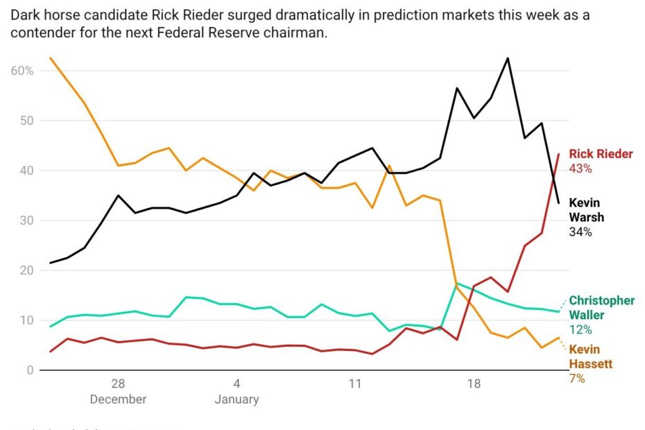 As recently as last week, prediction marketplace Polymarket ranked the probability of a Rieder chairmanship at just 3%. But on Friday afternoon, those odds jumped past 40%, putting him above former Fed Gov. Kevin Warsh as the leading contender.