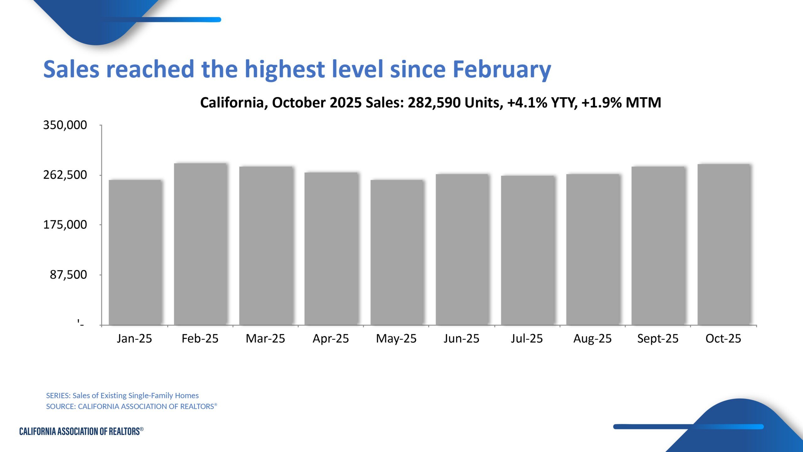 Sales of existing family homes totaled 282,590 in October, up 1.9% from 277,410 in September and up 4.1% from 271,370 in October 2024.