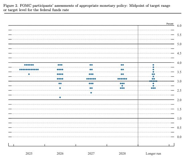 Seven members say they believe no further rate cut will be warranted next year. On the other hand, four call for one rate cut in 2026, four predict two, and four favor anywhere from four to six cuts.