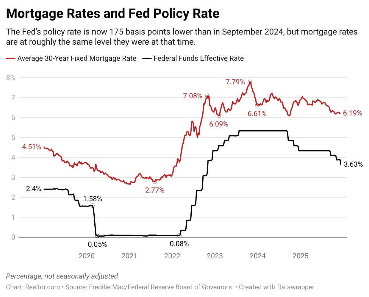 The Fed policy rate is now 1.75 percentage points lower than in September 2024, but mortgage rates have not experienced commensurate declines. In fact, last week’s average mortgage rate of 6.19% remains slightly higher than the two-year low reached in September 2024.