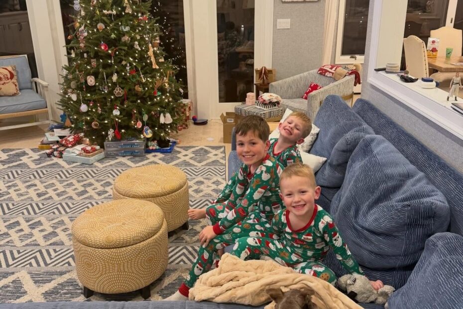 The first image showed her sons Calvin, 9, Oliver, 5, and Rusty, 3, sitting on the couch in matching holiday-themed pajamas in front of their shimmering Christmas tree.