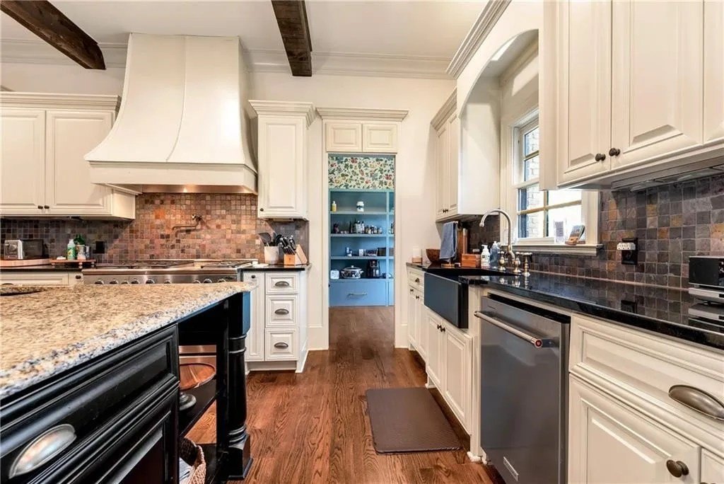 A pantry provides an incredible amount of storage, complemented by the kitchen’s many built-ins and cupboards.