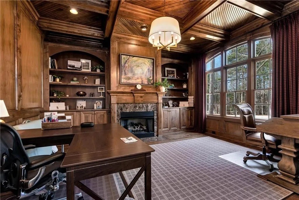 The third fireplace in the home is located in the stunning wood-paneled office, which overlooks the backyard and features beautiful built-in shelves, as well as a stately mantelpiece.