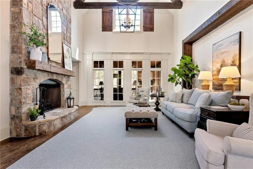 Inside, the home features a very traditional aesthetic, starting with an elegant entryway that leads to a soaring double-height great room, complete with a large stone fireplace and patio doors that open to the backyard.