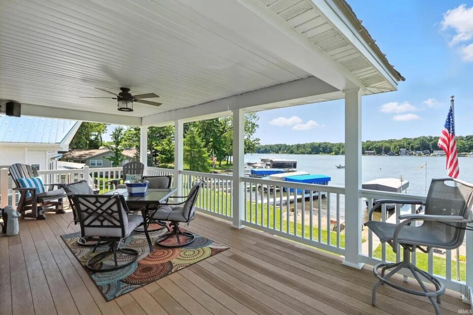 Just steps away from the lake, the expansive home features a porch with several seating areas and stunning views of the water.
