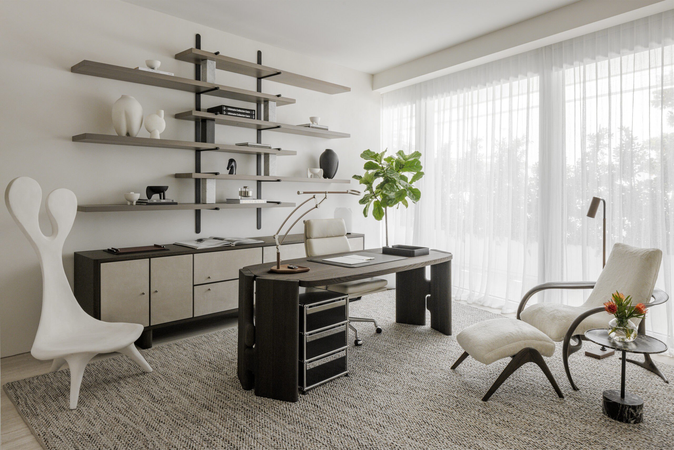 The office space comes complete with black furnishings and a slightly darker wood floor than the floor that adorns the rest of the home, and the same floor-to-ceiling windows.