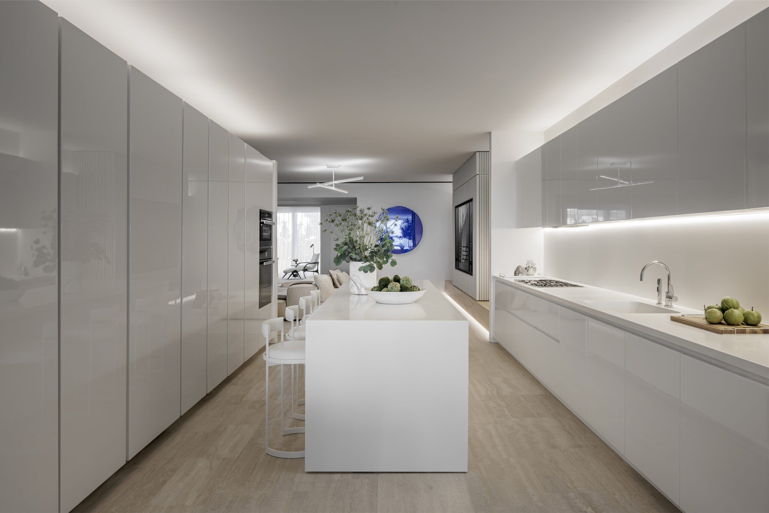 The chef’s kitchen is the epitome of sleek elegance and comes complete with vertical cabinets, a large island with bar seating, and state-of-the-art appliances.