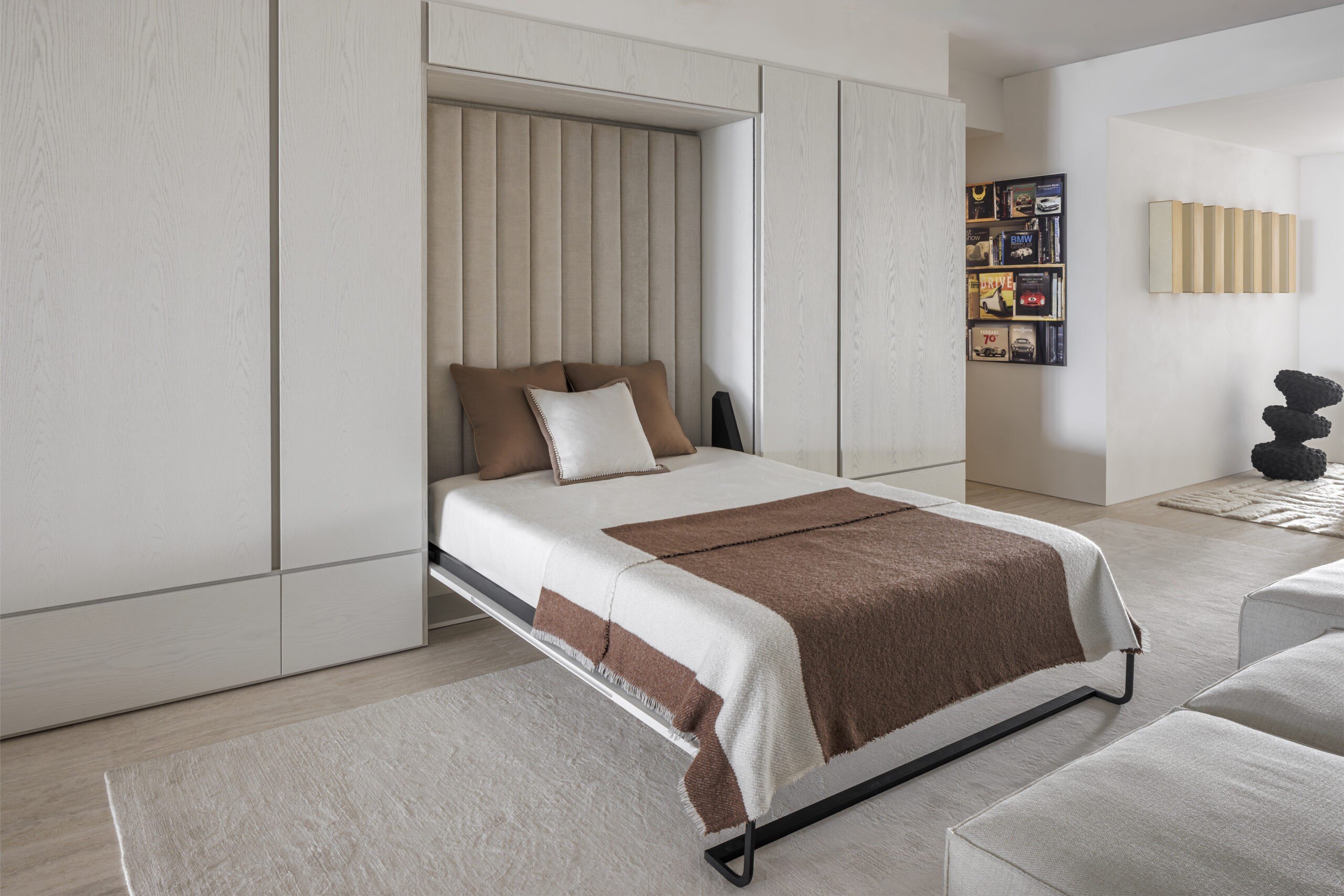 The living area boasts light-wood flooring, white walls, and floor-to-ceiling glass sliding doors.