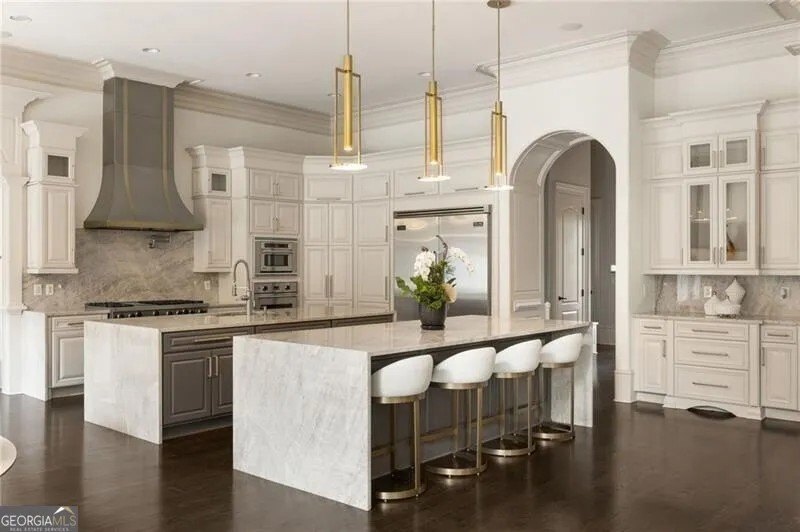 The kitchen features two islands, marble countertops, white cabinetry, and state-of-the-art appliances.