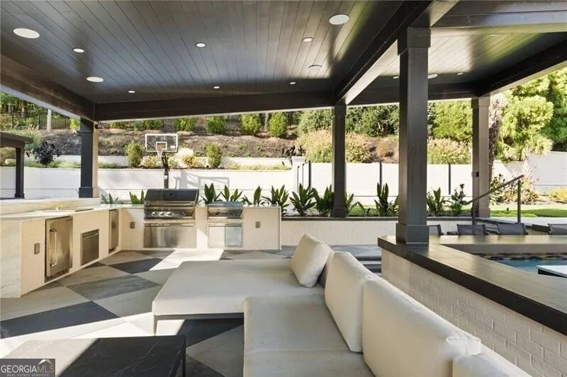 The space includes “dual islands topped with Taj Mahal quartz and premium stainless steel appliances set the stage for gatherings, complemented by an adjacent bar also finished in Taj Mahal quartz,” reads the listing.