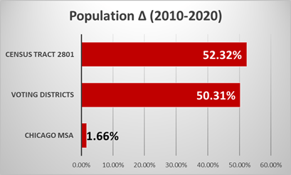Census tract 2801 covers a significant portion of the core of Fulton Market. With a population of 4,872 and 7,421 in 2010 and 2020, respectively, tract 2801 grew in population by 52%. The voting districts of the encompassing general Fulton Market grew by similar margins, with the population expanding from 4,617 to 6,940 in the same period. All the while, the Chicago metropolitan statistical area grew by only 2%.