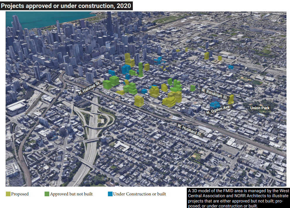 As a result, the land-use allowances and development climate shifted in favor of the growth and historical preservation of the Fulton Market. “Based on the recommendations in that plan, the City designated a landmark district to preserve the historic assets at the core of the [Fulton Market Innovation District], [and] updated the zoning code to remove the Planned Manufacturing District within the FMID to allow for a variety of commercial uses.”4