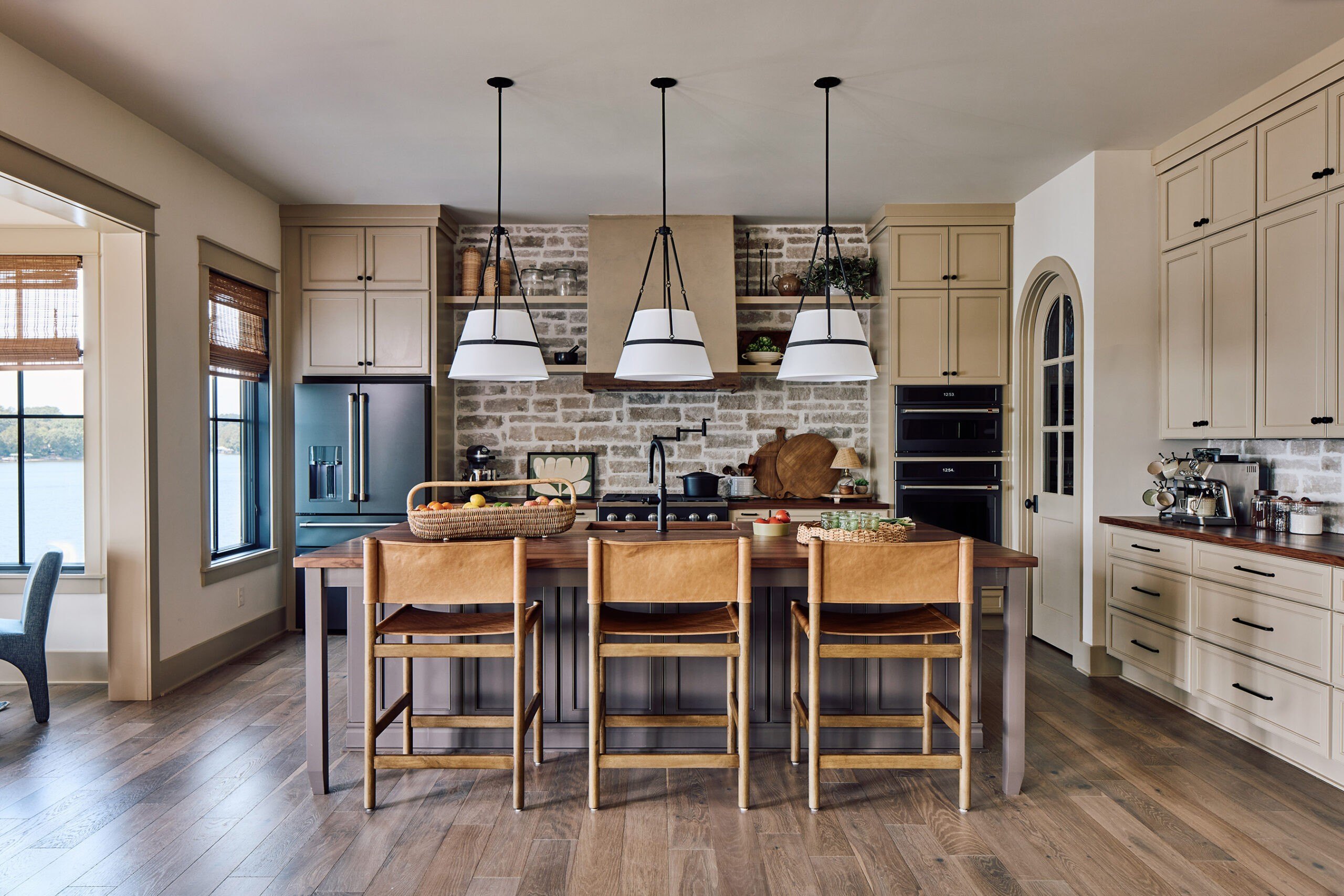 “Inside, the home showcases a harmonious fusion of indoor comfort with outdoor beauty. Inspired by the natural surroundings, the home is filled with a warm earth-toned palette, hand-laid stone, custom millwork, organic materials, classic furnishings, and vintage collectibles—bringing the lakeside vibe to life.