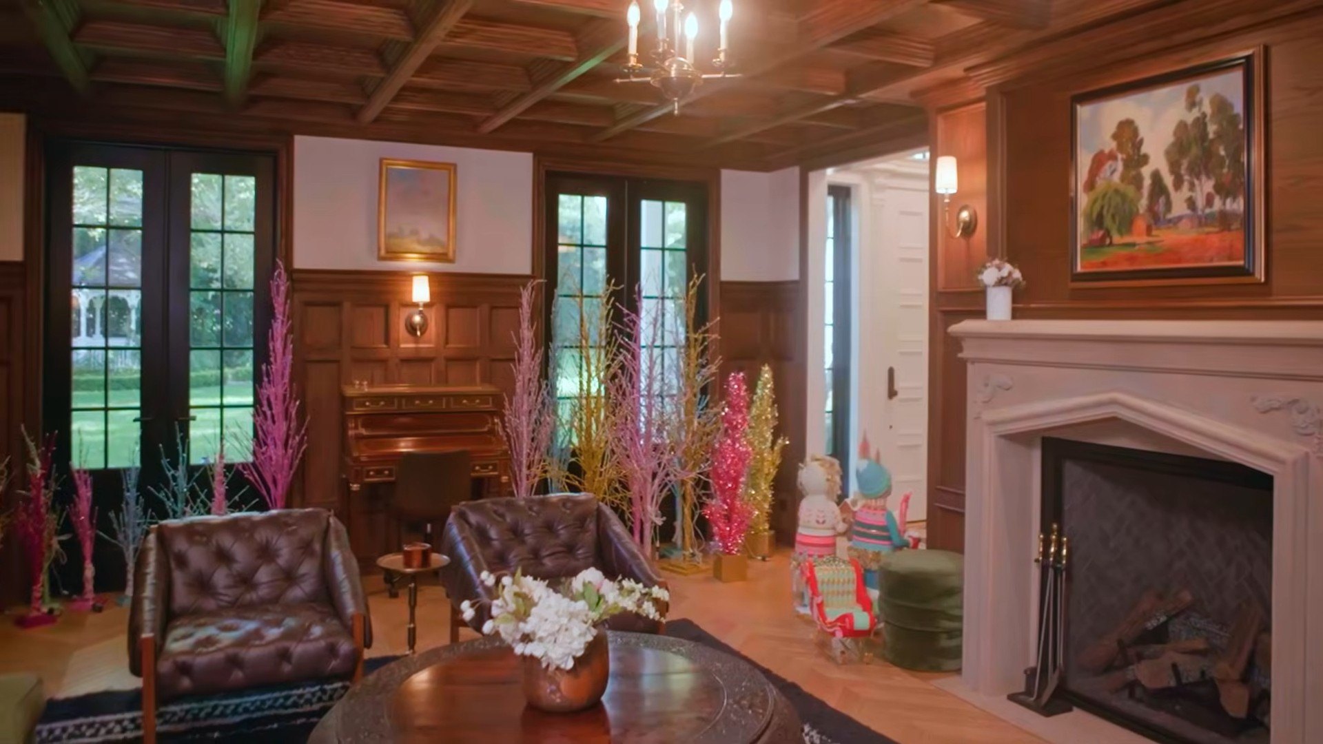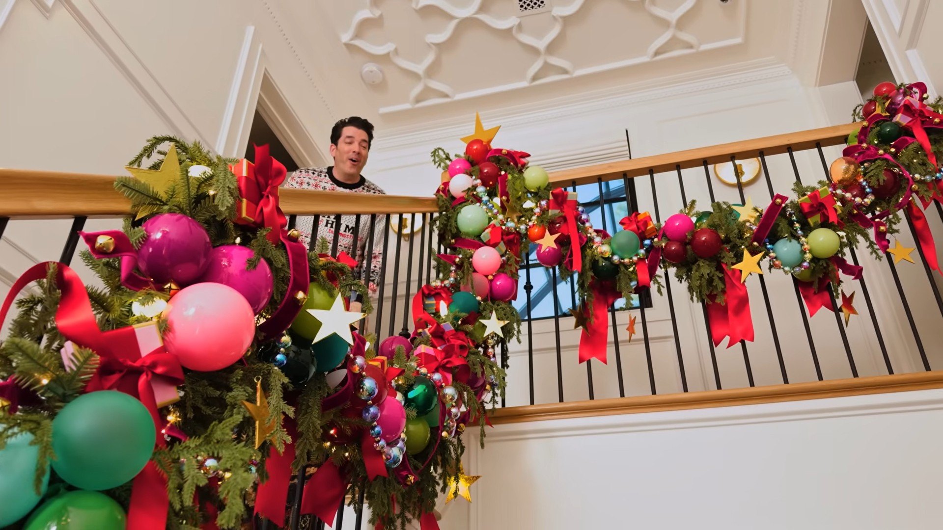 Then, they moved to the solarium, which already boasted a slew of colorful and lit up greenery, which they hung baubles from.
