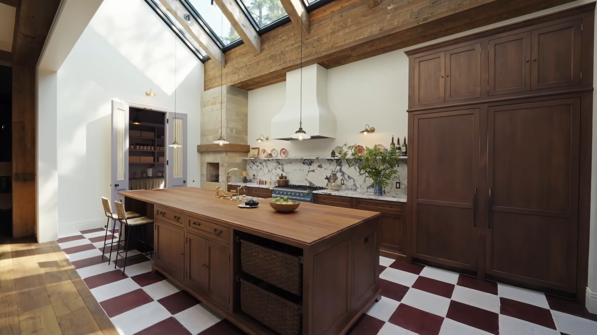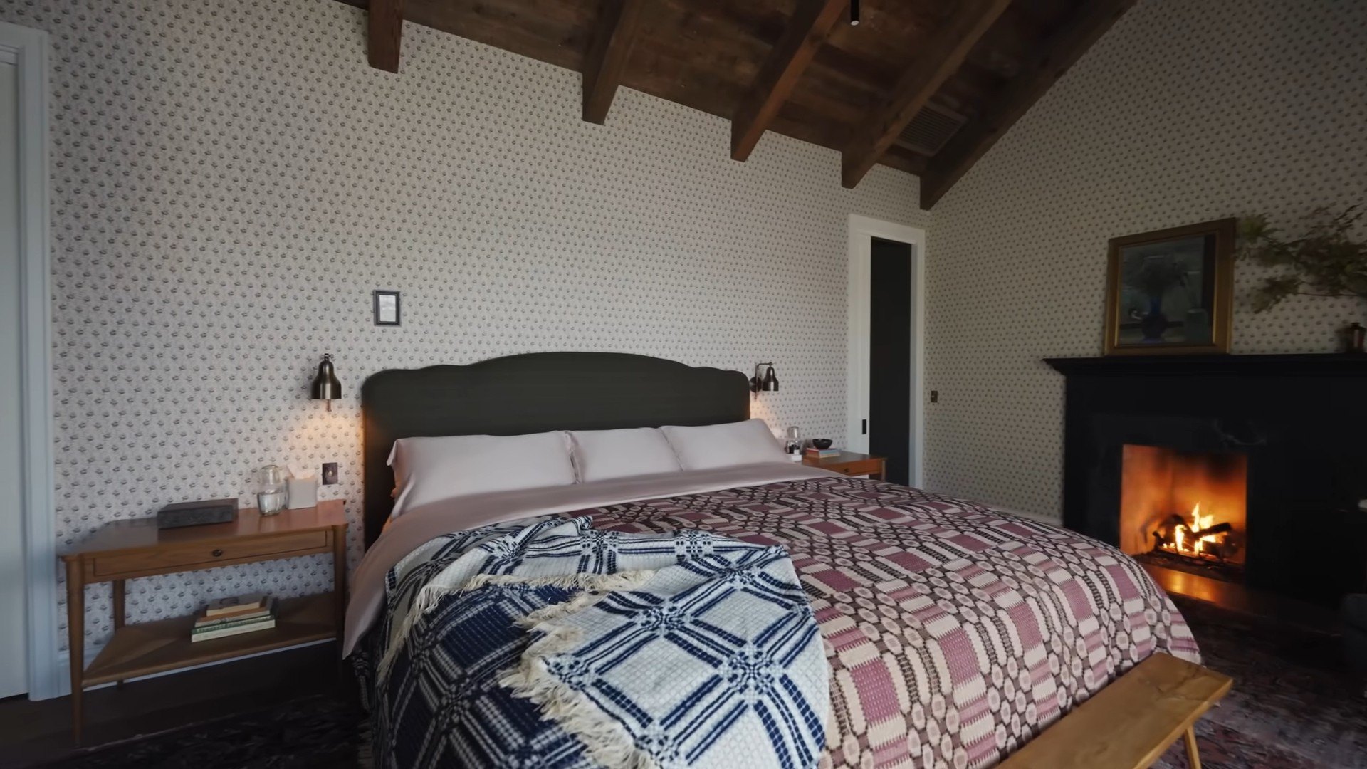 Heading into the bedroom, Jenner showcased the wooden ceiling beams, which help add to the rustic style of the home—even though it is, technically, brand new.
