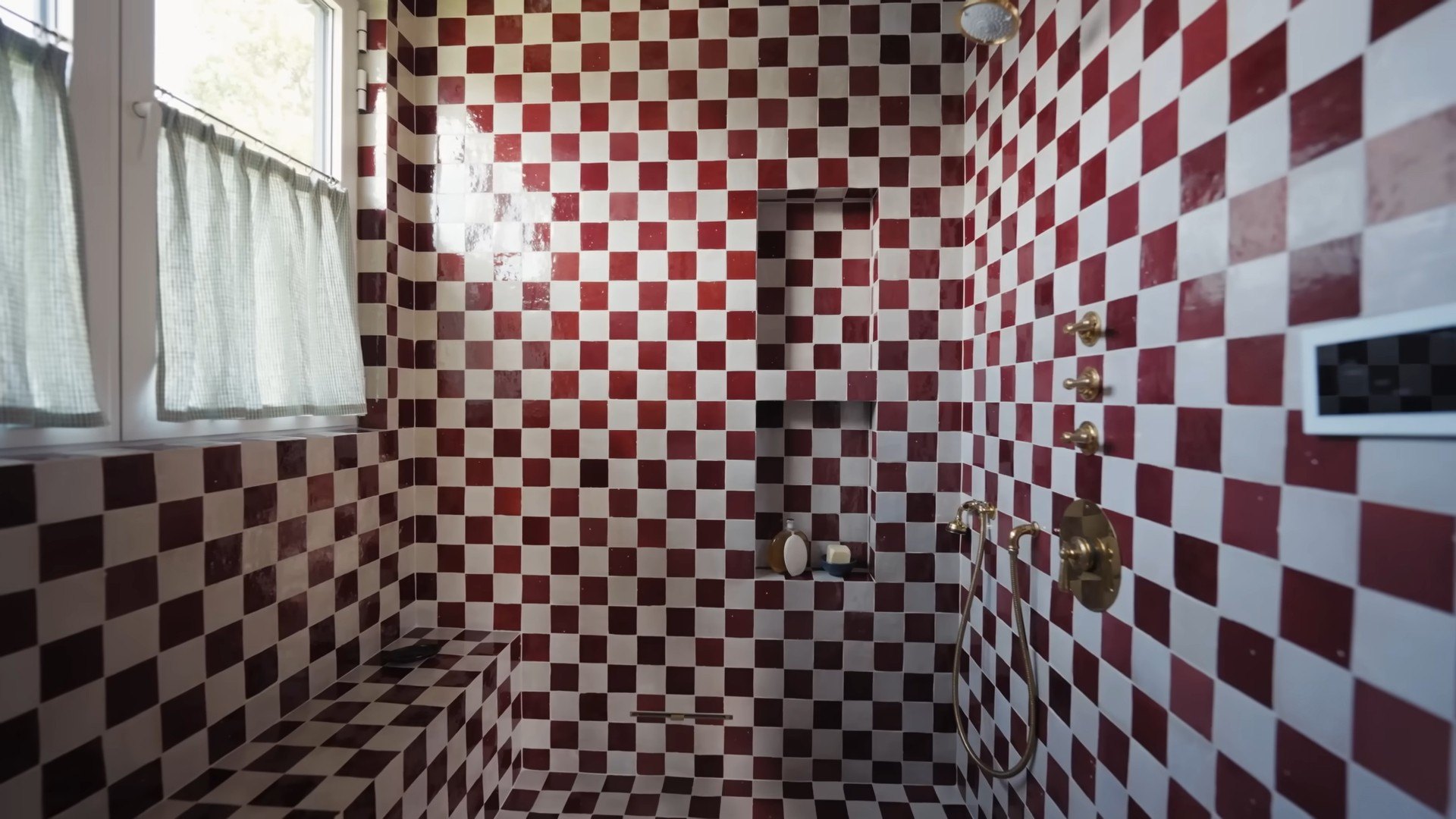 Moving into the bathroom, Jenner showed off her stunning shower, which is adorned with red-and-white checkered walls.