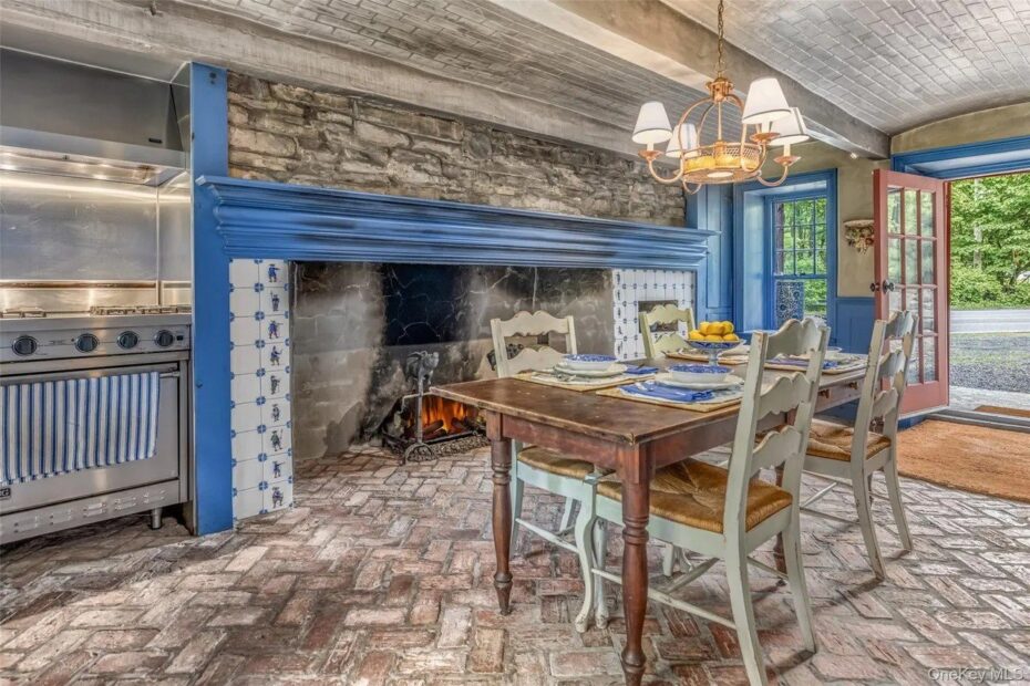 The beautiful kitchen with a walk-in fireplace and brick flooring (Realtor.com)