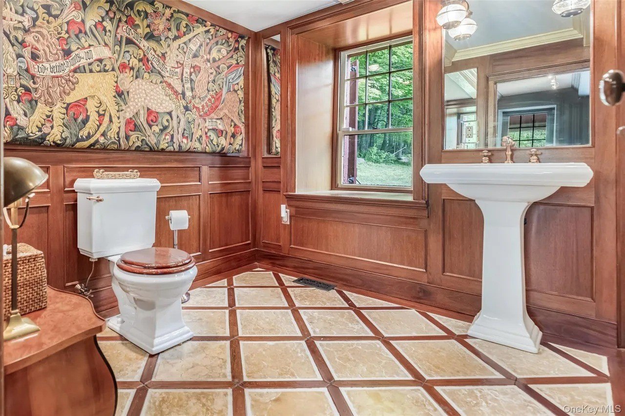 A mahogany bathroom features custom tilework. (Realtor.com)