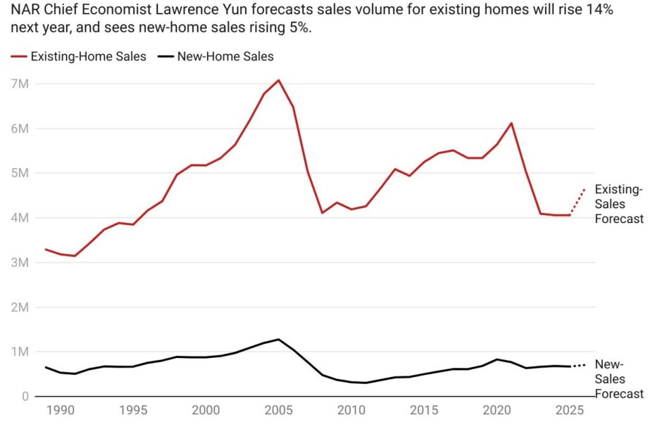 NAR Chief Economist Lawrence Yun forecasts sales volume for existing homes will rise 14% next year after three years of stagnation, and sees new-home sales rising 5%.
