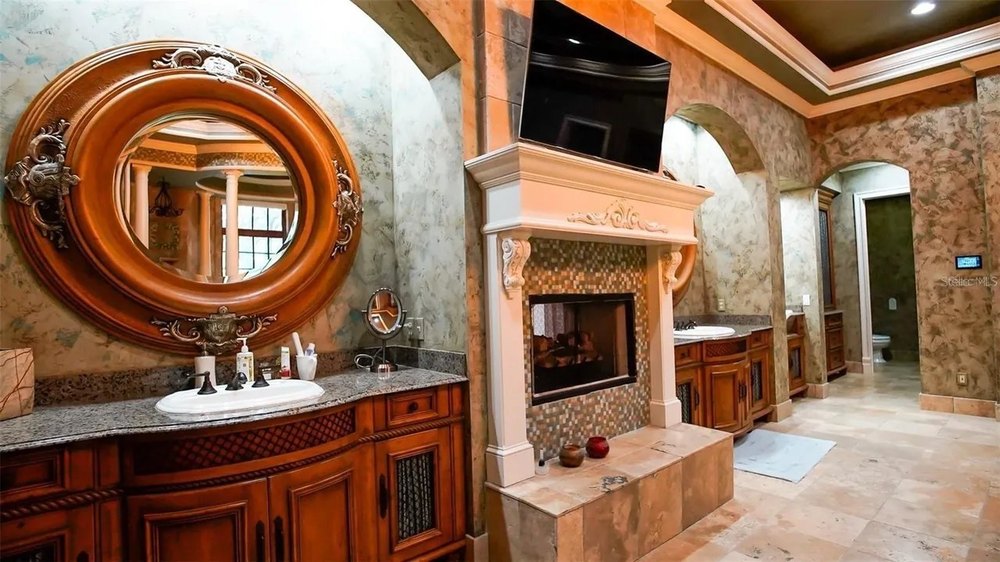 The master bathroom comes complete with an elegant design, including a soaking tub, fireplace, and dual vanities.