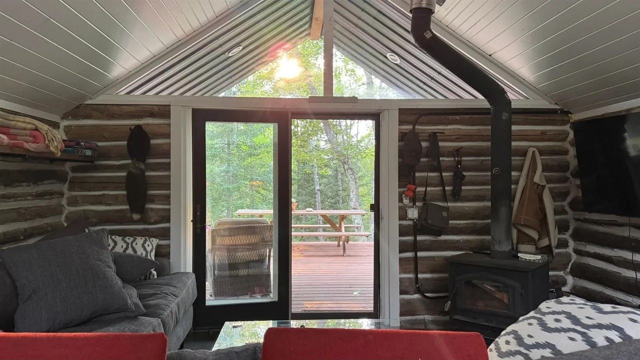 To modernize the cabin, the sellers updated the living room, kitchen, bath, and deck. The cabin also features a wood-burning stove.