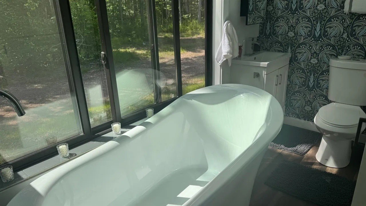 In that shipping container are two bedrooms, a full bath, an outdoor shower, and outdoor decks. Hardwood floors and lots of windows make the interior feel cozy, light, and bright. In the bathroom is a freestanding soaking tub in a space that artfully frames a view of the outdoors.