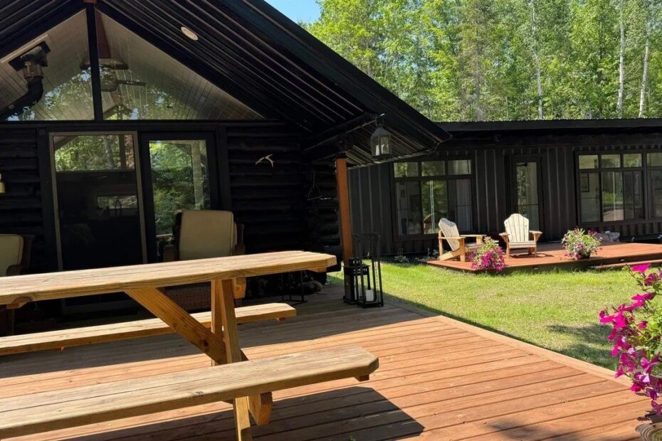 But a 20-acre property for sale in Northern Wisconsin features both: a sleek converted shipping container and a vintage log cabin. Each is painted black for a contemporary aesthetic.