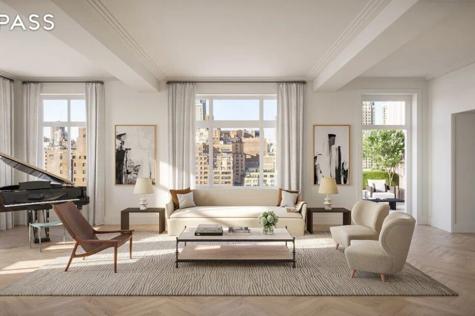 Both penthouses have five bedrooms and 5.5 baths with high ceilings, fireplaces, and outdoor terraces offering skyline views and glimpses of Central Park.