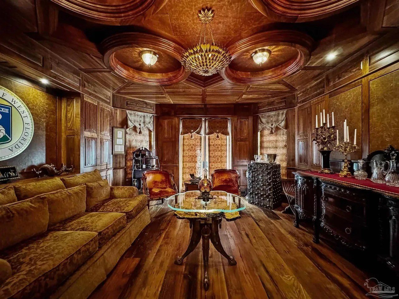 A wood-paneled gentleman’s armory features hand-carved cabinetry. (Realtor.com)