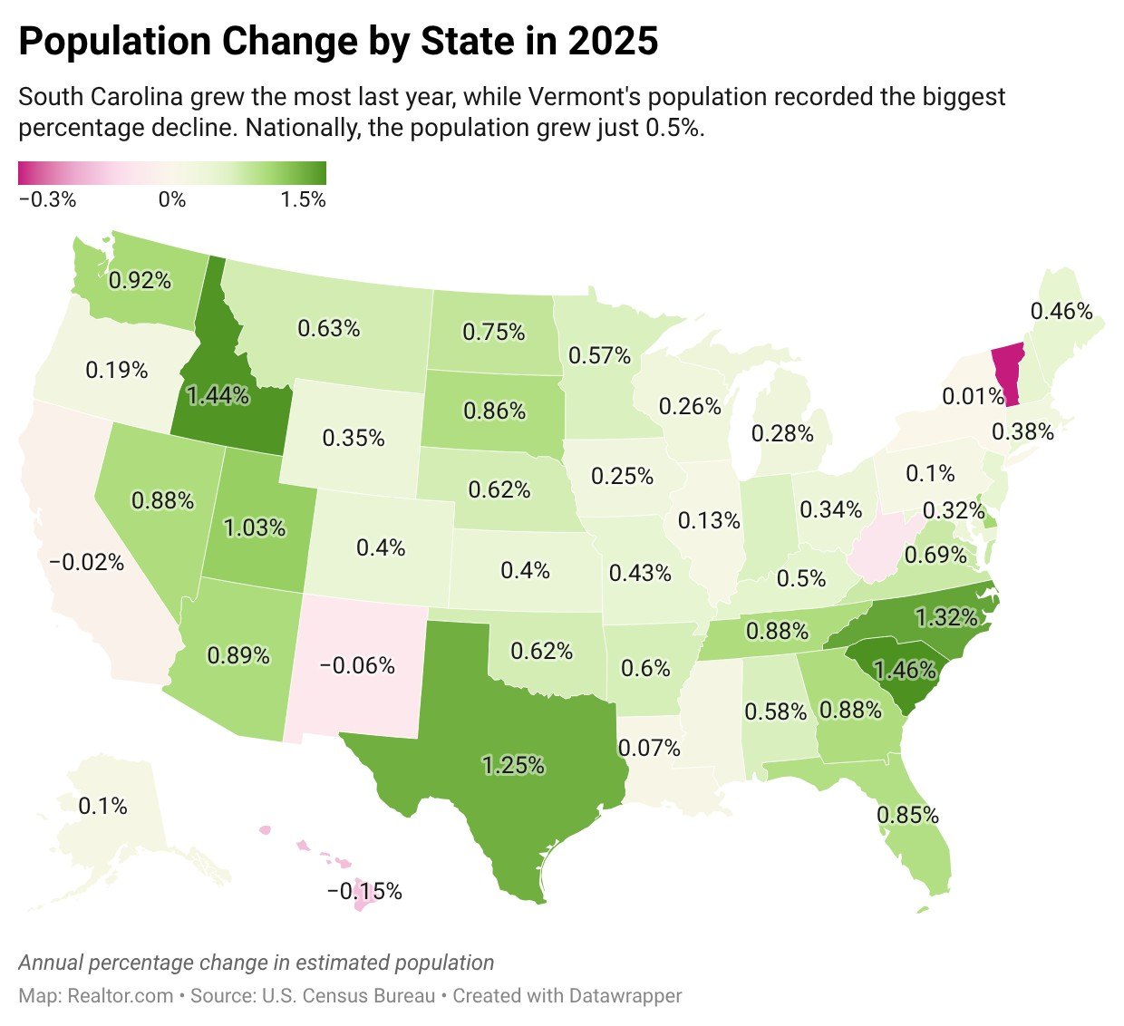 South Carolina saw the biggest percentage increase in population last year, growing by 1.5%. Domestic migration (people moving from other states) fueled most of the growth, with international immigration also contributing. Natural growth played no role, with deaths slightly outnumbering births.