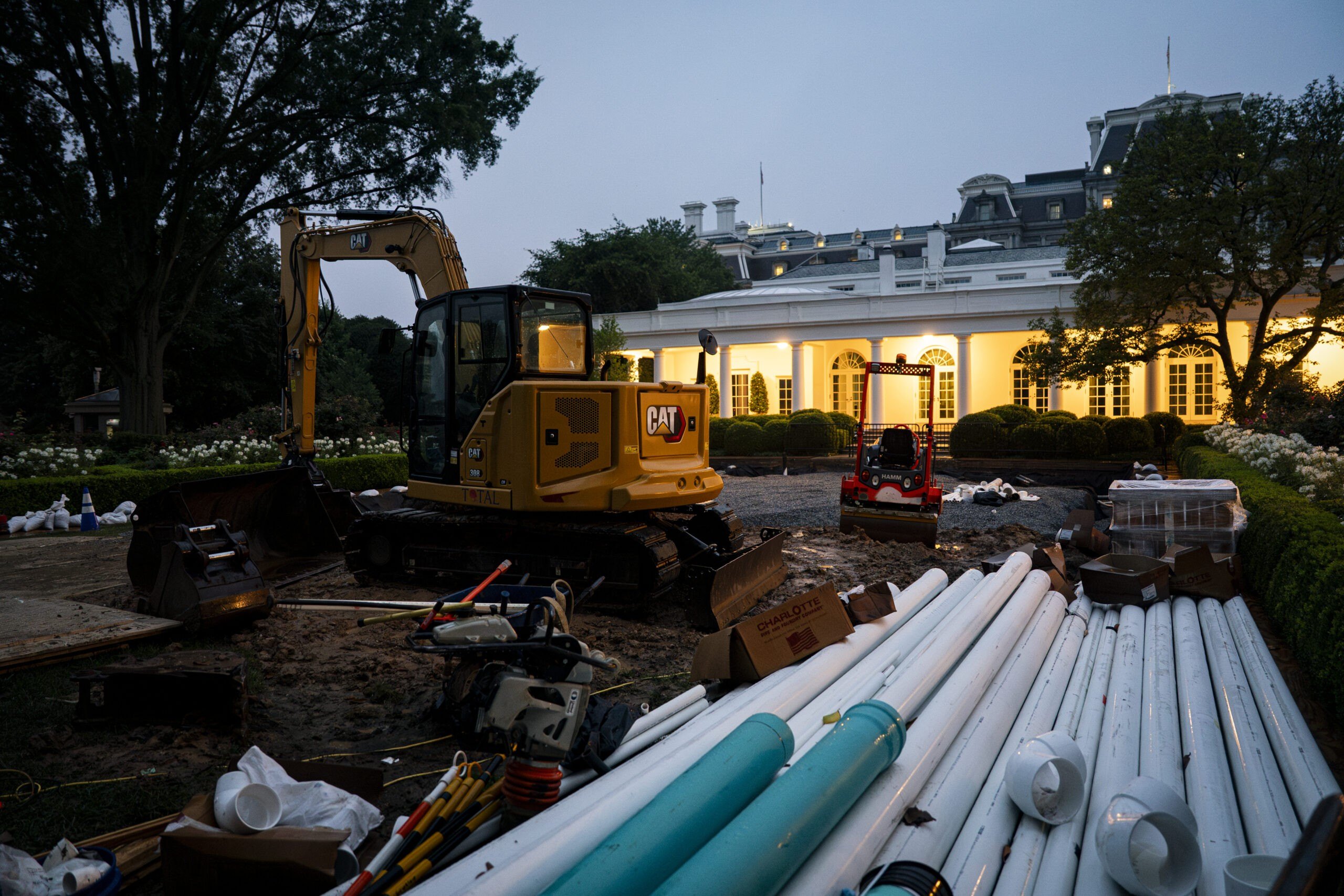 The renovation quickly progressed, with images taken on June 17 and June 18 revealing that the entire lawn had been ripped up by bulldozers—as well as several poles that were under the ground—before gravel was laid across the entire surface.