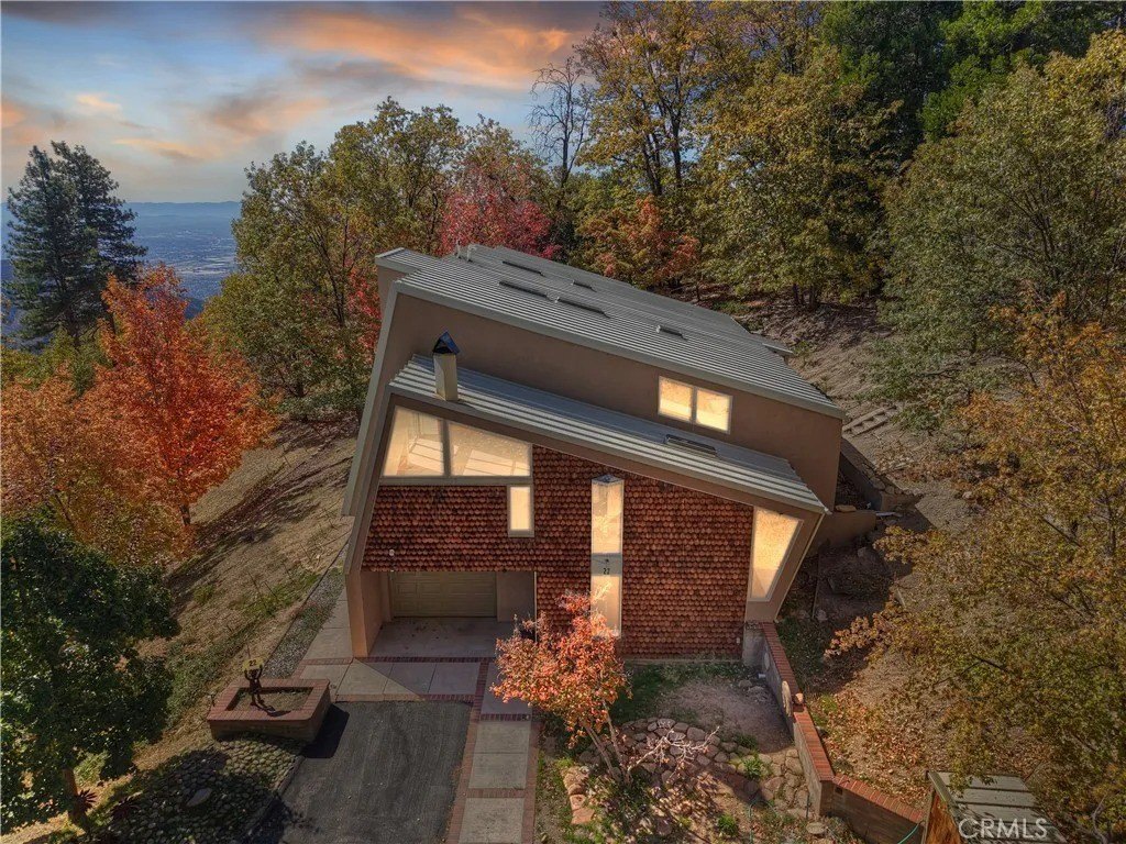 Located in Smiley Park on 2.45 acres, the three-bedroom residence built in 1999 was designed to showcase “an impressive sense of space and light” found throughout the polygon-inspired 2,496-square-foot interior. Highlights include slate floors, sliding glass doors, skylights, built-in window seating, a circular staircase, and two main-floor primary bedrooms. There is also a one-car attached garage.