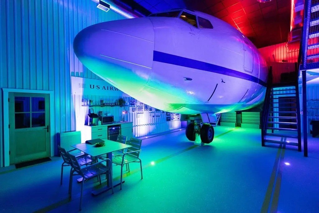 The investment property that has been used as a short-term rental still features many components from the aircraft, including the front portion of the plane, making it quite a conversation piece in the living room.