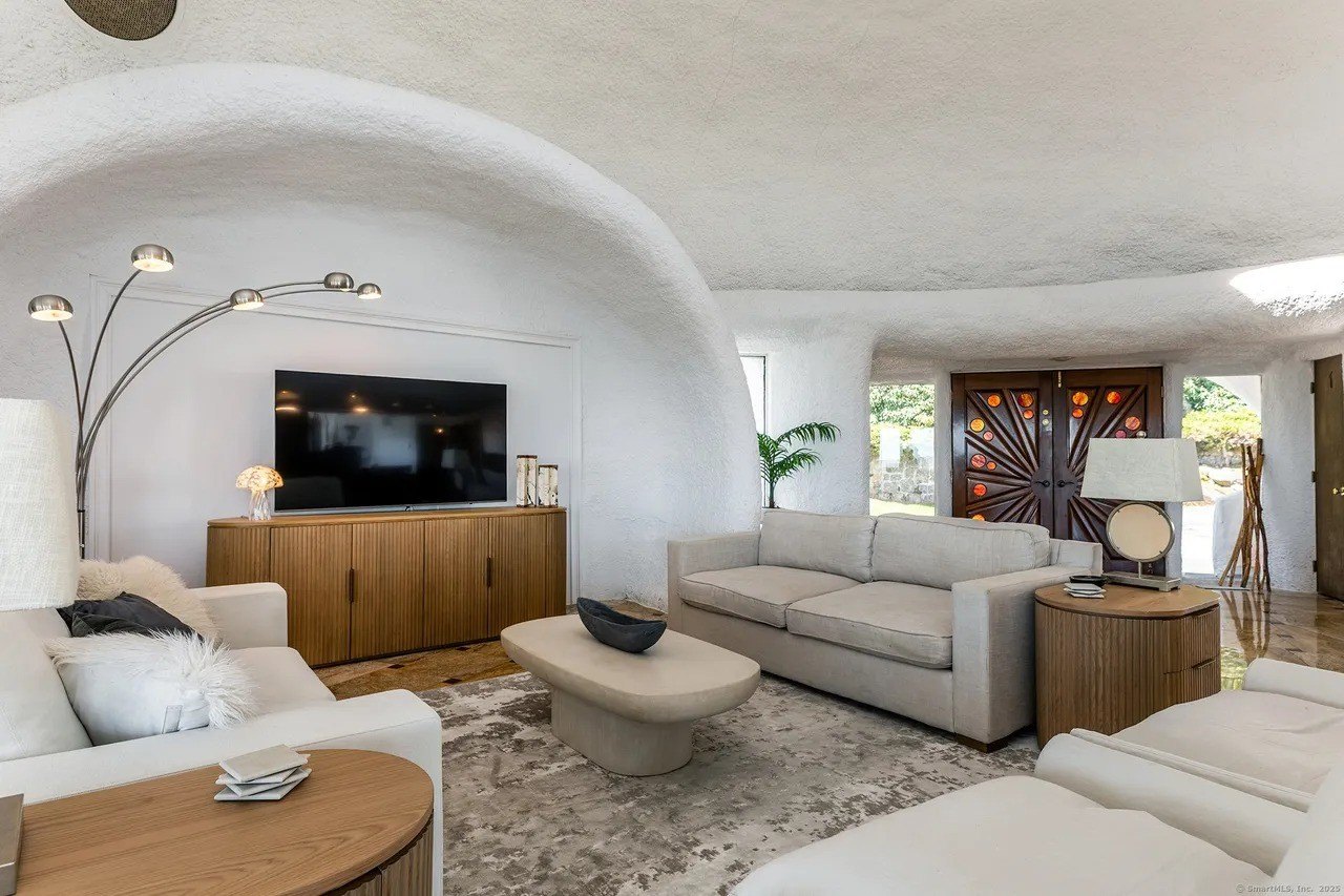 Artistic details throughout the four-bedroom residence include stone floors, a curved kitchen, a sunken conversation pit, and a spaceship-inspired second-floor loft.