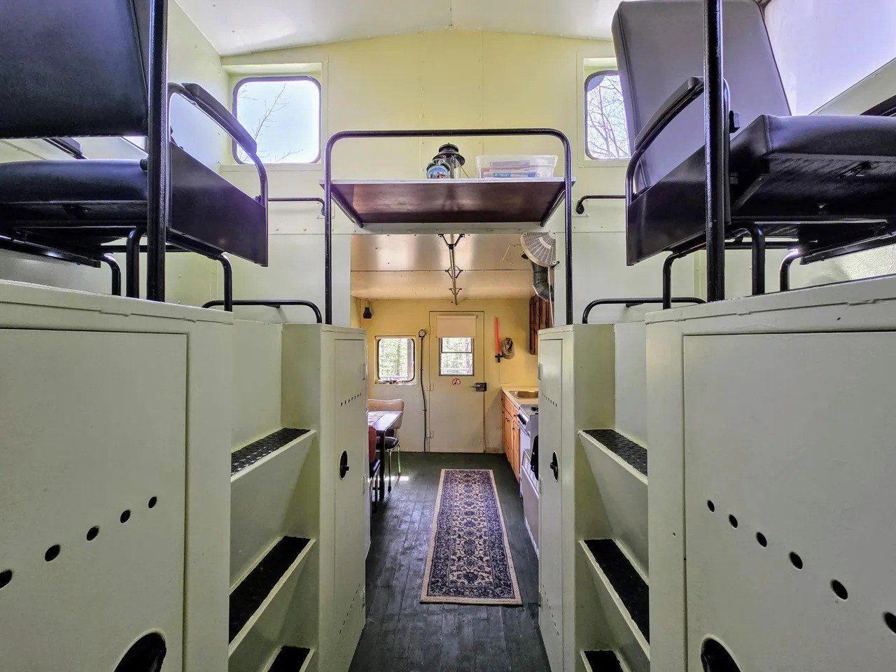 Found throughout the 360-square-foot vintage residence, offering sleeping accommodations for up to five guests, are original observation seats found in two loft areas, an antique steering wheel, and sidecar windows to let in an abundance of natural light. Originally listed for the very affordable price of just $129,000, the property was offered fully furnished when it hit the market earlier this spring.
