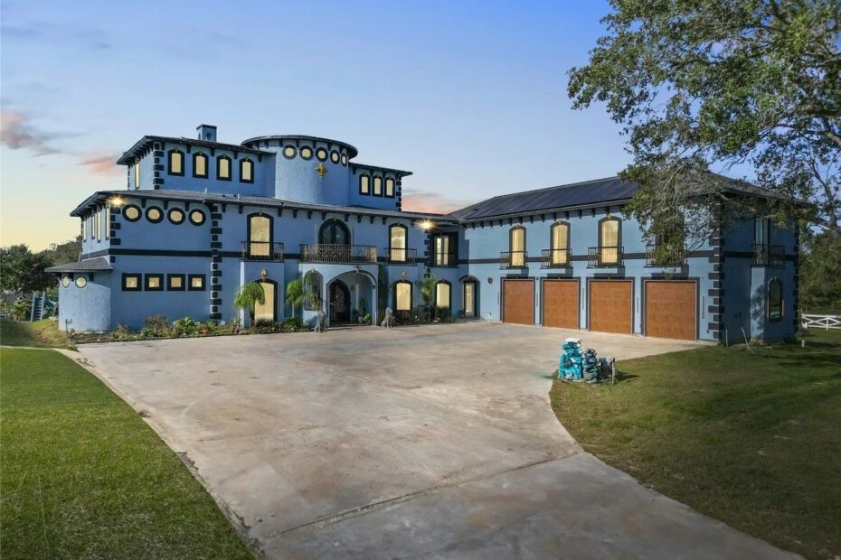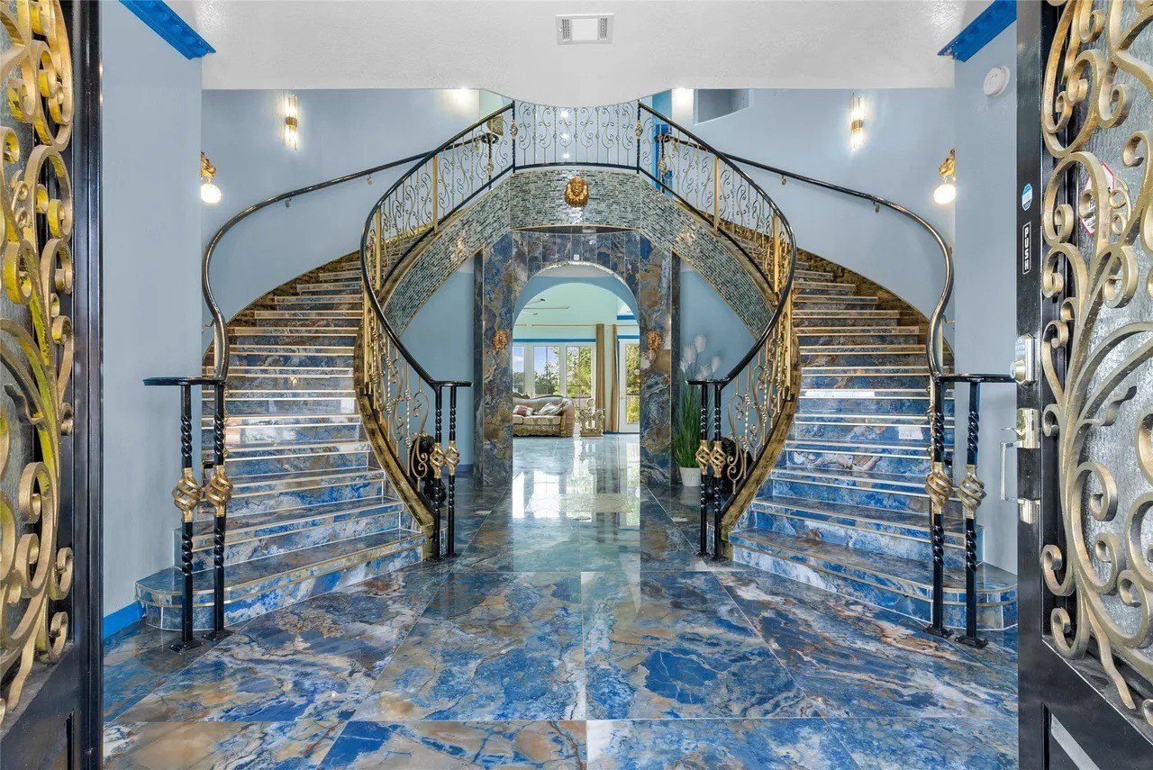 From cobalt tile floors and painter’s tape-colored crown molding to azure walls and aqua-colored tile, the underwater-inspired interior of this ornate eight-bedroom residence was the brainchild of its seller who coincidentally owns a local pool company.