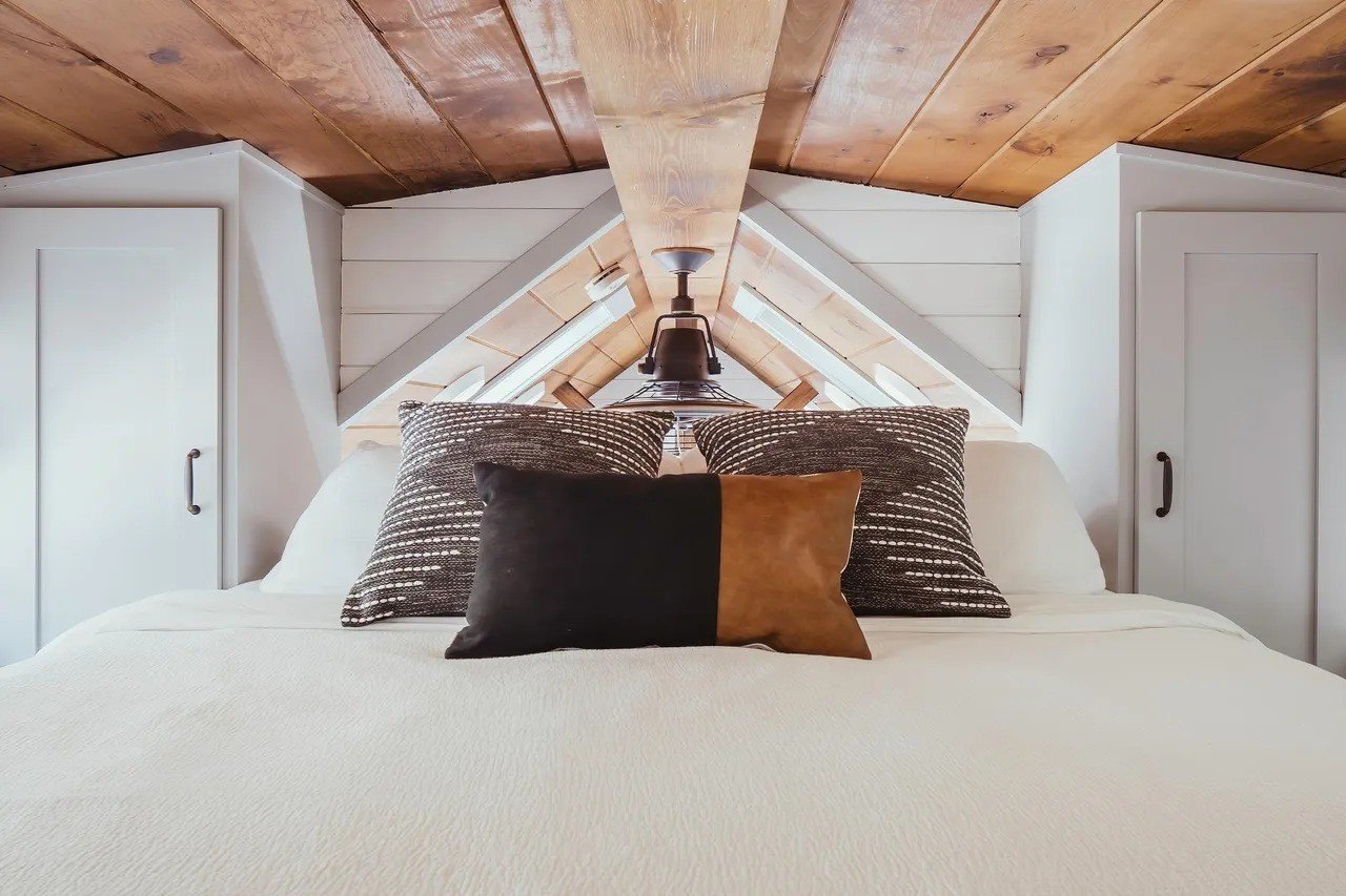 “Most tiny homes have ladders that go upstairs, but this one has a full set of stairs that go up to the bedroom,” she notes. “Each of the stairs has a drawer for extra storage as well.”