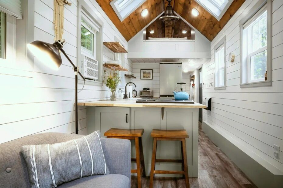 “They really do a remarkable job decorating and designing their properties,” Laserte says. “Kitchens in most tiny homes often have smaller appliances, but this one has a full-size stove and sink. There are a lot of amazing features, including a small soaking bathtub with shower.”