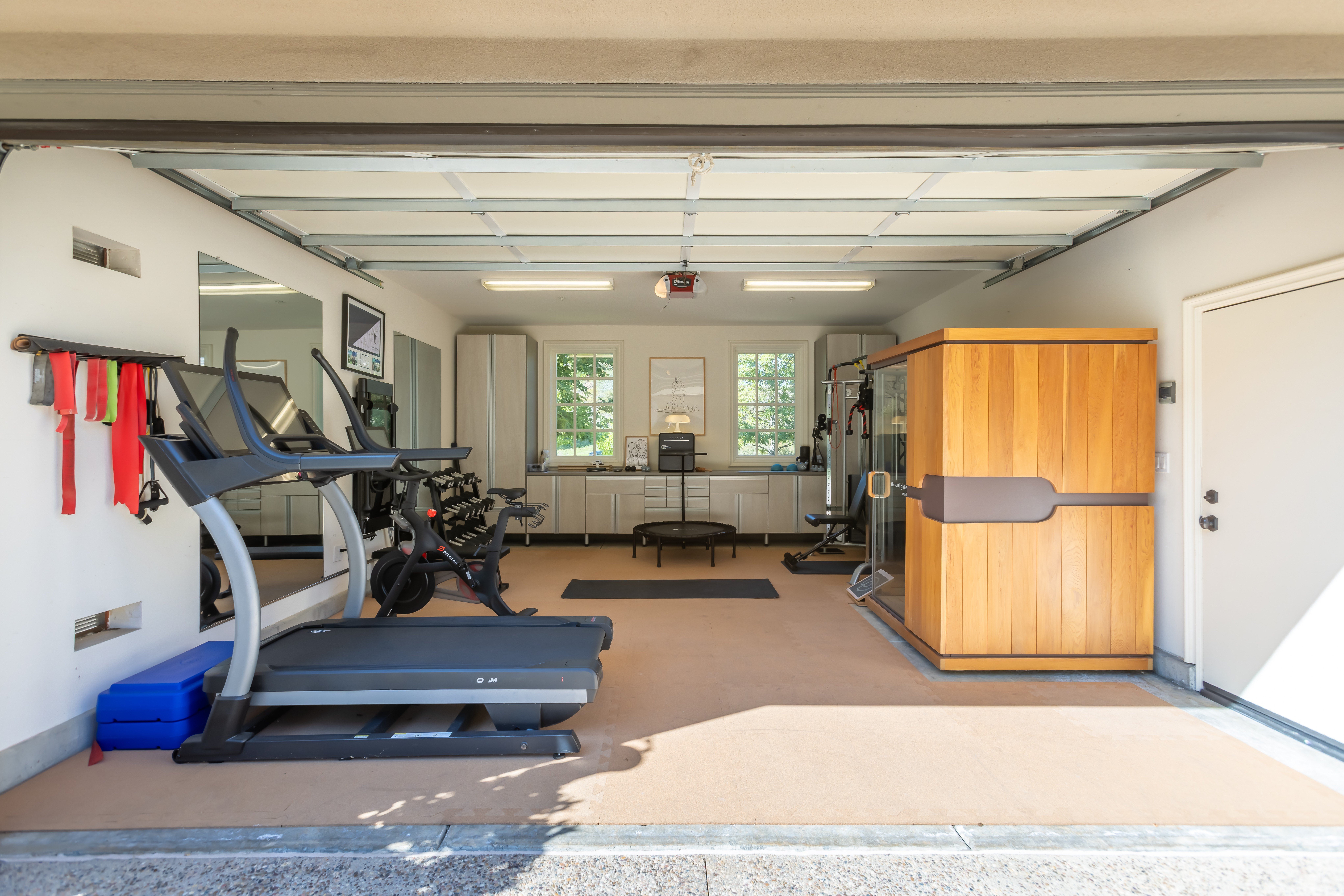 Each of the five bedrooms is en suite, with the primary suite boasting dual walk-in closets. Also in the home is a private gym, a sauna, nontoxic finishes, and a whole-house water filtration system, all tapping into wellness.