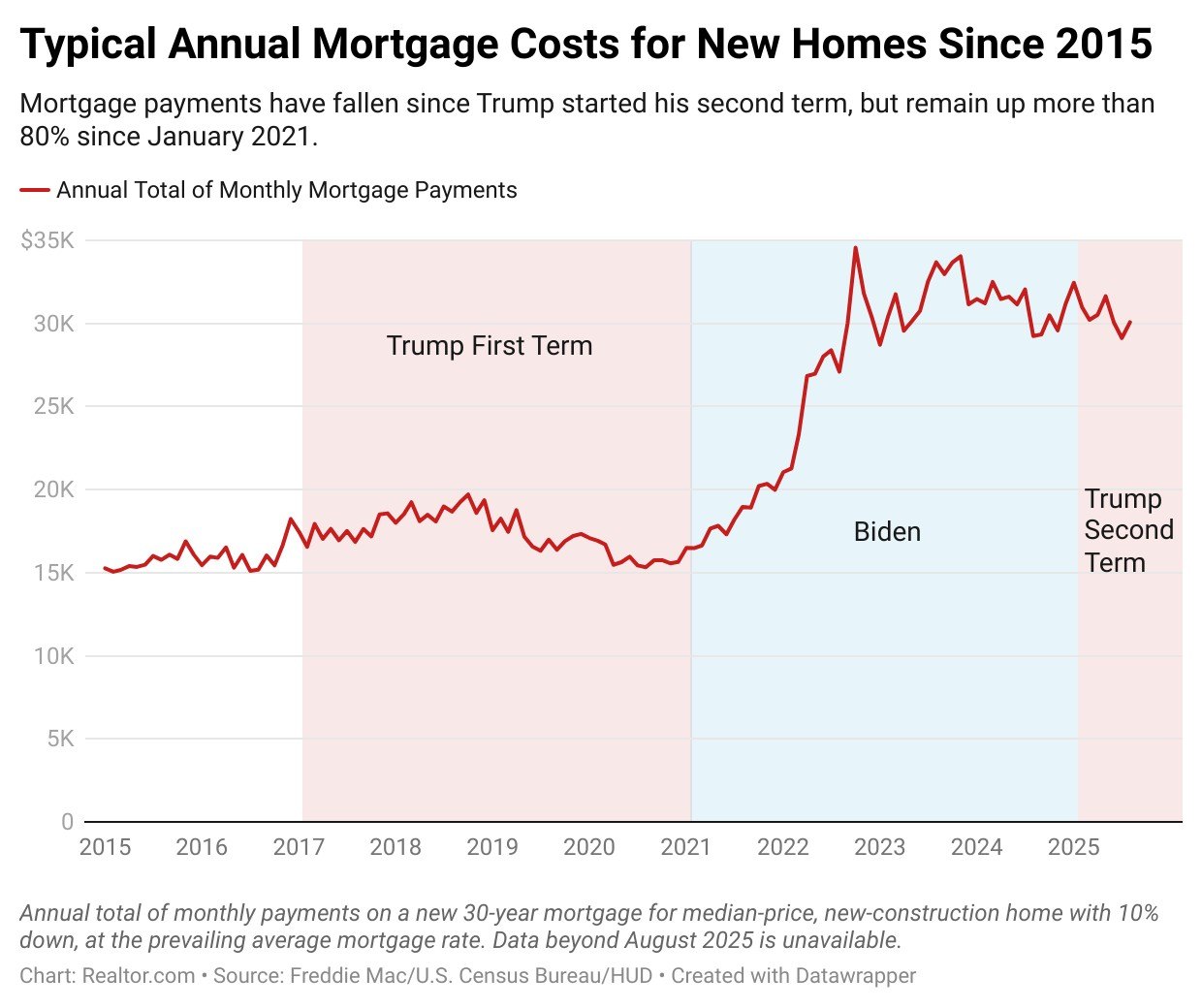 However, it glosses over the fact that median mortgage payments remain more than 80% higher today than at the end of Trump’s first term, despite recent improvements. And using prices for previously owned homes rather than new homes, the savings under Trump drop to just $45 per month.