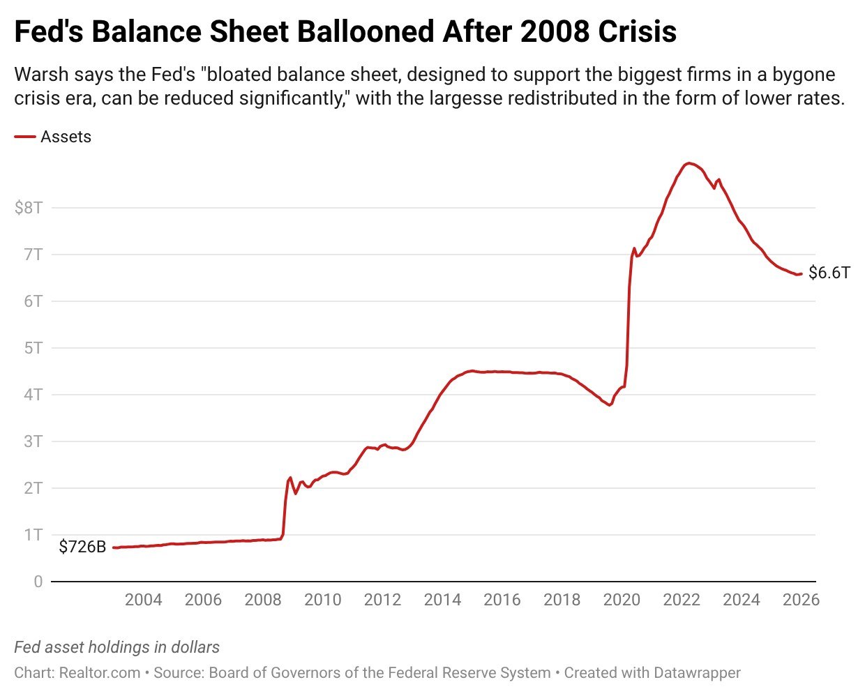 The key to unlocking lower rates, argues Warsh, is significantly reducing the Fed’s massive balance sheet, which stands at more than $6.6 trillion in Treasury notes and mortgage-backed securities.