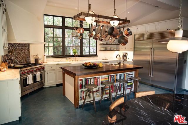 Even the kitchens (there are several on the premises), blend Old World features, like open shelving, colorful Spanish tile, and racks for copper pots, with the latest in stainless-steel appliances and low-maintenance tile flooring.